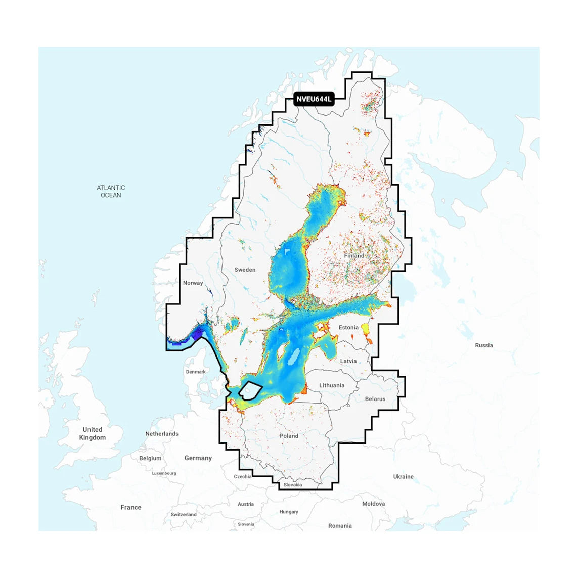 Detailed coverage of the Baltic Sea and lakes of Scandinavia and Poland. Coverage includes the Gulfs of Bothnia, Finland and Riga; the Masurian Lakes in Poland, the Szczecin Lagoon, Lake Peipus; Lakes Mjøsa, Bandak and Norsjø in Norway; Lakes Vänern, Vättern, Siljan and Storavan in Sweden; Inarijarvi, Miekojarvi, Simojarvi, and Kiantajarvi in Finland among many others. Ports include Oslo, Norway; Malmo and Stockholm, Sweden; Oulu and Helsinki, Finland; St Petersburg and Kaliningrad, Russia; Gdansk, Poland.