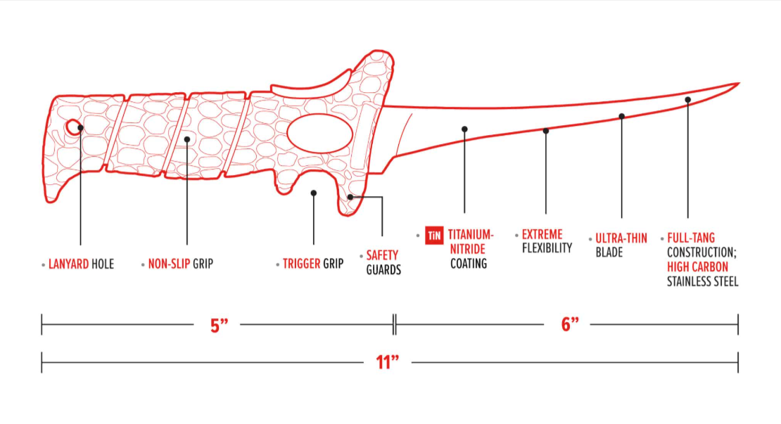 Similar to its big brother, this 6-inch Ultra Flex fillet knife comes loaded with extreme flexibility and a ridiculously thin blade. The combination of the two makes this knife essential for your collection. Bring this knife with you because its full tang construction is designed to be your go-to for everything. Whether you're cutting for detail or bone removal, it will be your best friend. Because it is the little brother to the 8-inch knife, it's suited ideally for Crappie or smaller panfish. This secret weapon is your key to success.