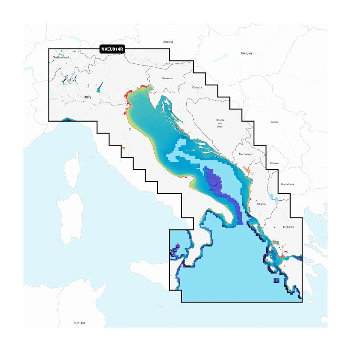 Coastal coverage of the Po River and the Adriatic coast of Italy, Slovenia, Croatia, Albania, the western coast of Greece and southern Italy. Coverage includes eastern Sicily, the Straits of Messina, the Dalmatian Coast, the Gulf of Taranto, Lago Maggiore, Lago d'Iseo, Lago di Como and Lago di Garda.