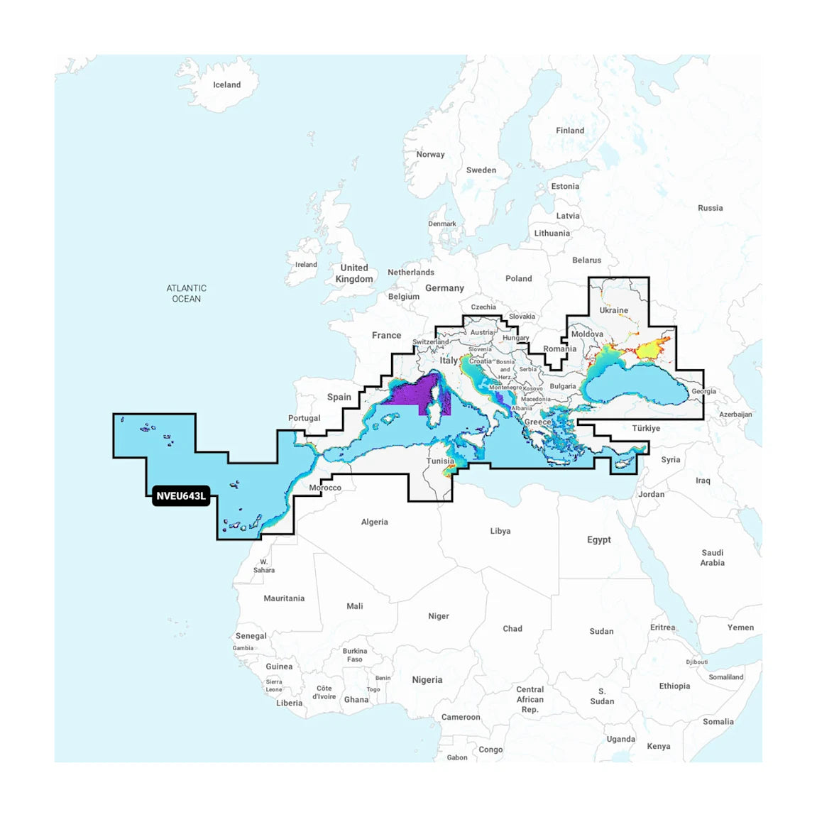 Detailed coverage of the Mediterranean and Black Seas. Coverage includes the Azores, Madeira, the Canary Islands, Gibraltar, the Balearic Islands, Corsica, Sardinia, Sicily, Malta, Crete, Cyprus, the Dardanelles, the Bosporos, the Sea of Azov, the Dneiper River to the Kyivs'ke Reservoir, the Danube River to Passau, Germany, Lake Balaton, Lake Garda, Lake Como and Lake Maggiore. Ports include Cadiz and Barcelona, Spain; Monaco; Marseille and Toulon, France; Genoa, Naples, Taranto and Venice, Italy; Istanbul, Türkiye; Odessa, Ukraine; Tunis, Tunisia and Algiers, Algeria.