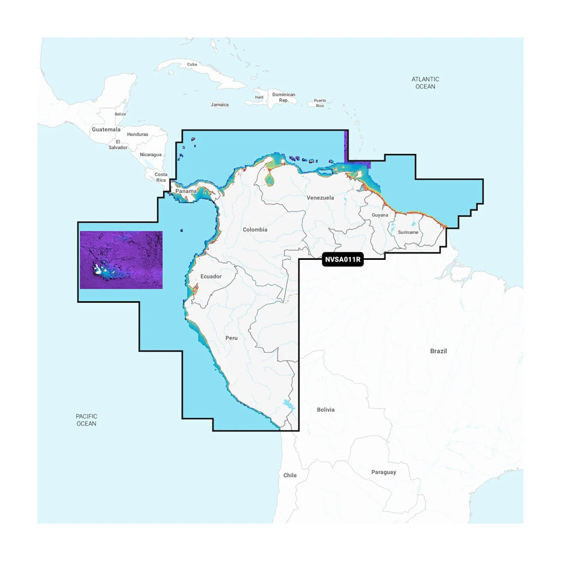 Detailed coverage of entire coast of Panama including the Canal. Coastal coverage of Peru, Ecuador, Columbia, Venezuela, Trinidad and Tobago, Guyana, Suriname and French Guiana.